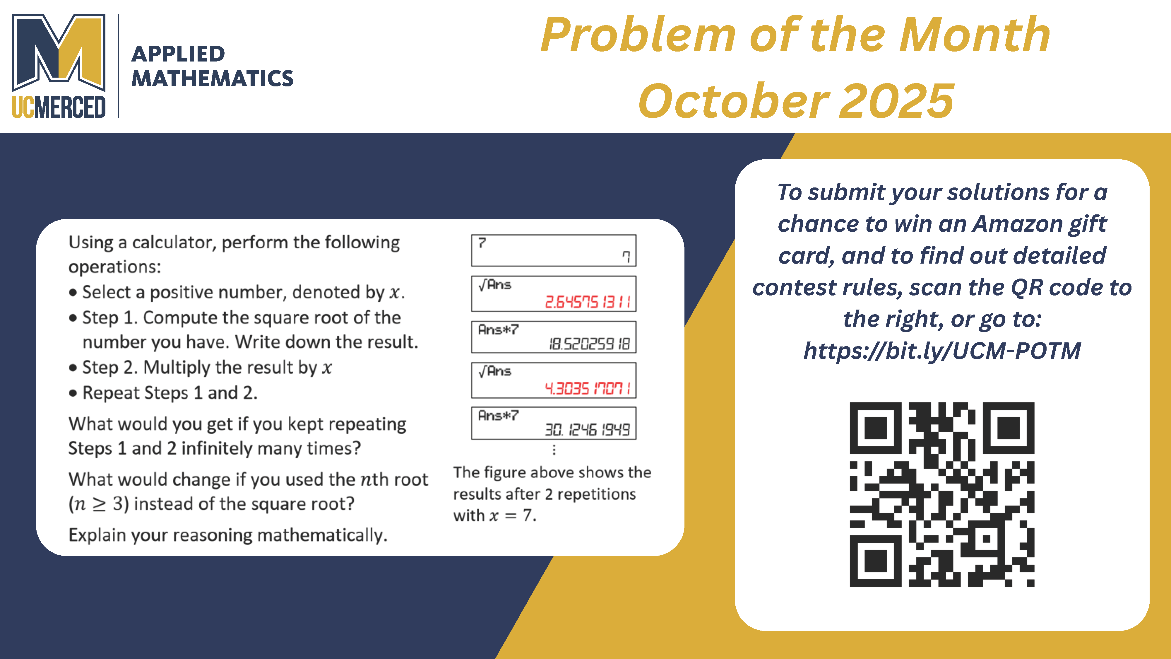 by Thursday, November 6. - Any undergraduate students who submitted top and/or creative solutions will be recognized on the Applied Mathematics Department website. They will be entered into a drawing for an Amazon gift card of $50 and an Applied Math Department mug.