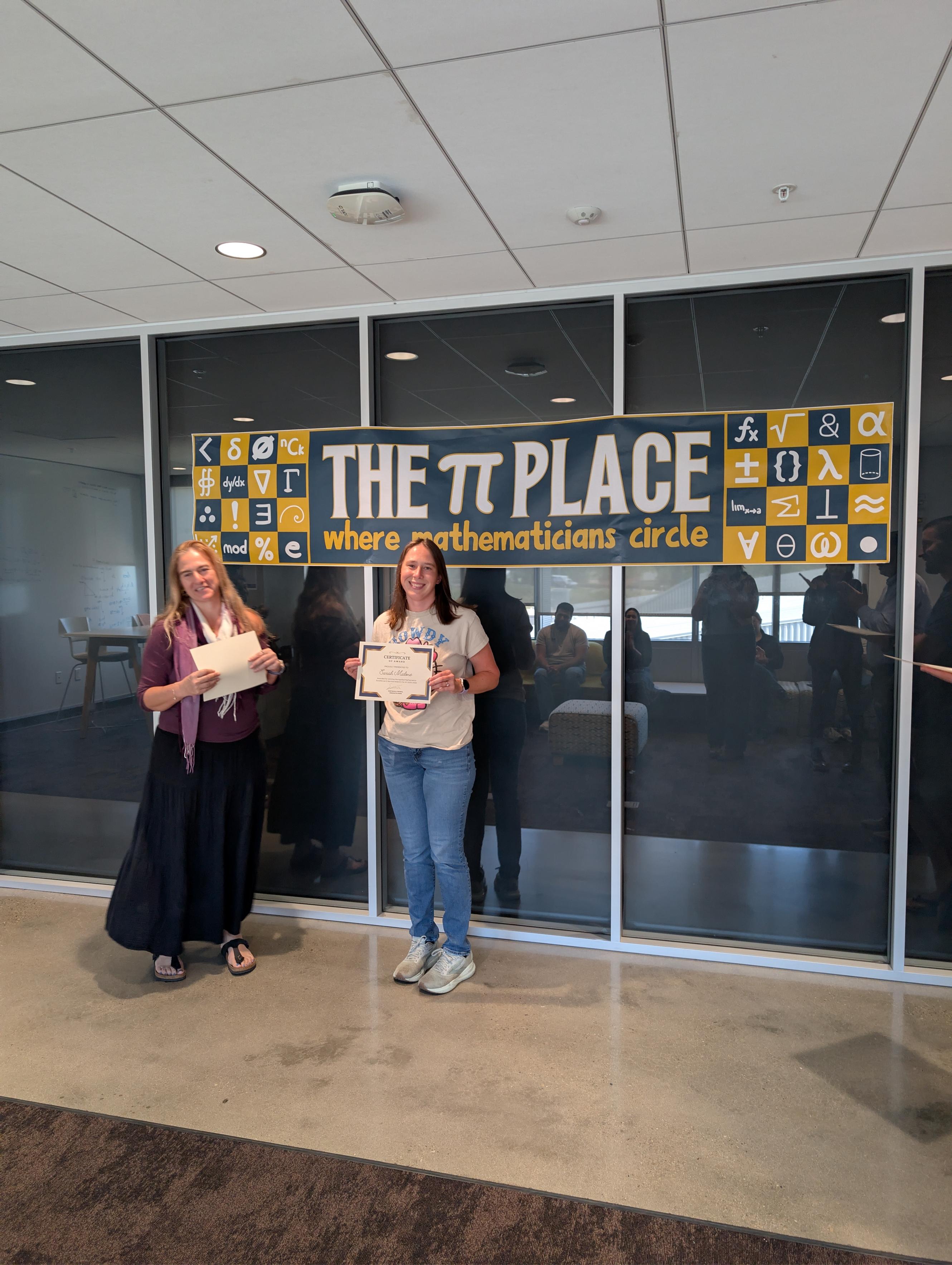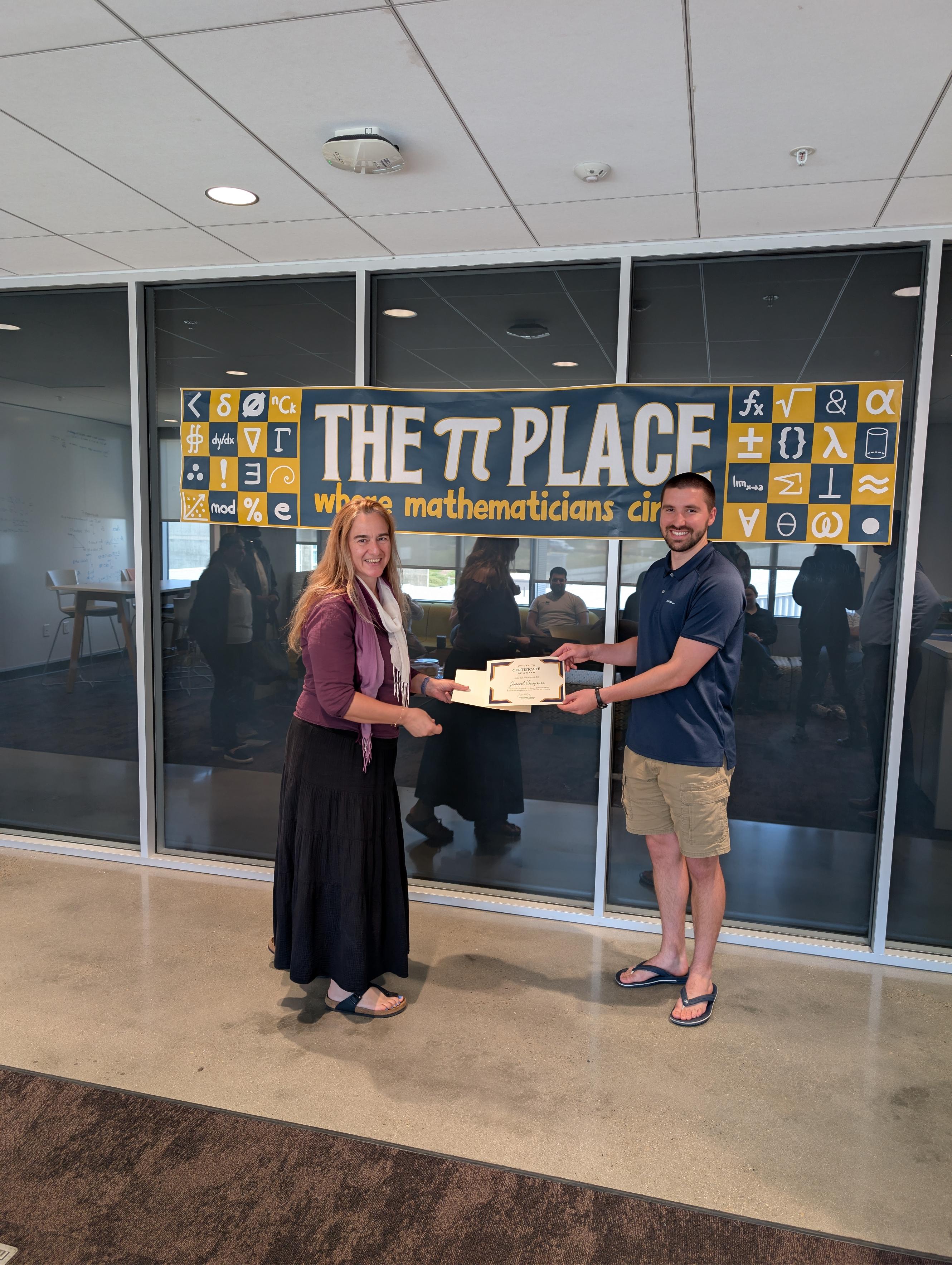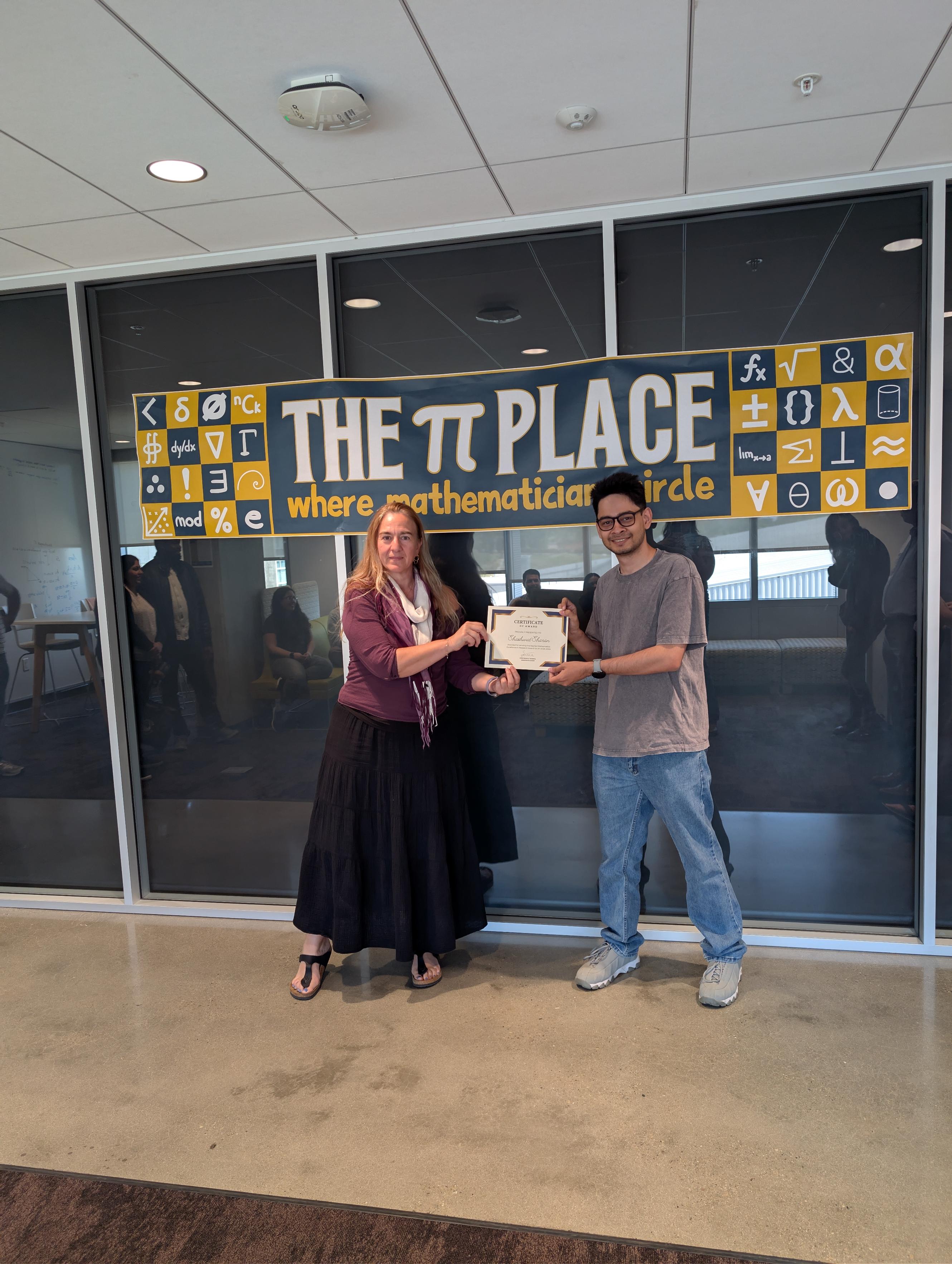 Pictured: Graduate Chair Prof. Chrysoula Tsogka presenting awards to Joseph (Teaching), Sarah (Exceptional Service), and Shashwat (Research) at the Pi Place, UC Merced, April 14, 2026.